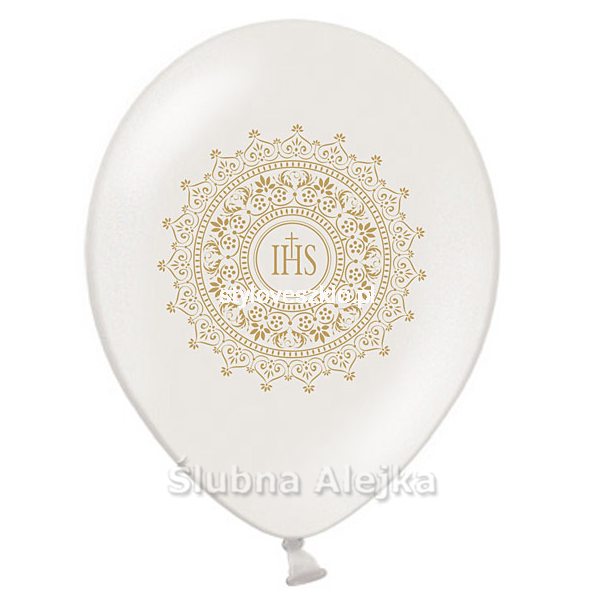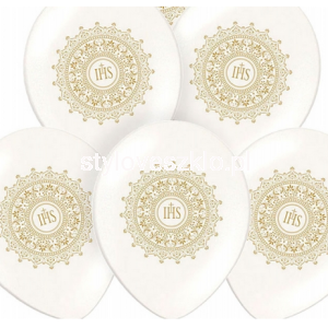 Białe balony komunijne z nadrukiem IHS. Idealne do udekorowania przyjęcia komunijnego Twojego dziecka.