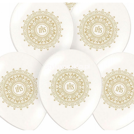 Białe balony komunijne ze złotym nadrukiem IHS. Idealne do udekorowania przyjęcia komunijnego Twojego dziecka.