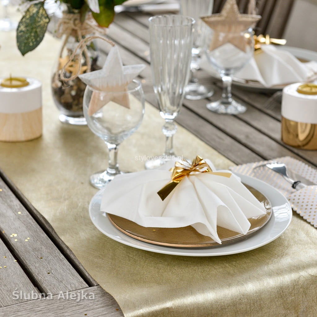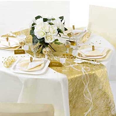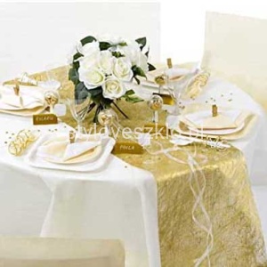 Bieżnik metaliczny flizelinowy występuje w naszej ofercie w dwóch metalicznych kolorach: złotym i srebrnym. Splot włókien tworzących flizelinę kreuje wyjątkową fakturę materiału znakomicie prezentującą się podczas eleganckich przyjęć. Bieżnik stanowi tak mocny akcent dekoracyjny, że oprócz niego inne dodatki nie są konieczne.