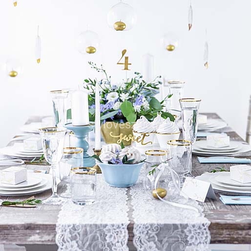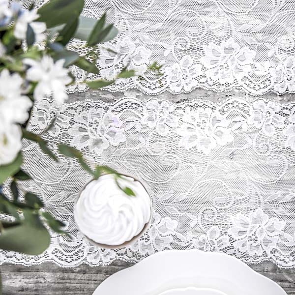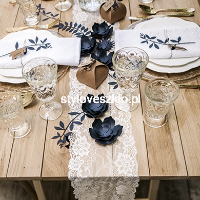Bieżnik koronkowy bardzo łatwo wpleść w każdą aranżację, ponieważ jest jedynie delikatnym dodatkiem, który nie rzuca się w oczy, a jedynie podkreśla styl nakrycia. Brzegi bieżnika są wyhaftowane wzorami charakterystycznymi dla tego rodzaju stylistyki. W takiej aranżacji sprawdzą się również klasyczne w swoich kształtach naczynia i akcesoria.