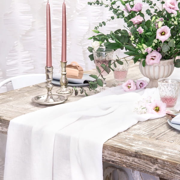 Bieżnik muślinowy dobieramy do rodzaju przyjęcia, ale także do aranżacji. Z powodzeniem zastąpi obrus na drewnianym stole lub udekoruje nakrycie pofałdowanym kształtem, okalając półmiski, patery, świeczniki i karafki. Bieżnik muślinowy, który oferujemy, jest w kolorze jasnokremowym, co sprawia, że jest uniwersalnym dodatkiem, dodającym eleganckiego charakteru całemu przyjęciu.