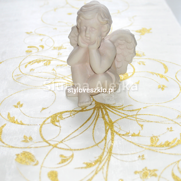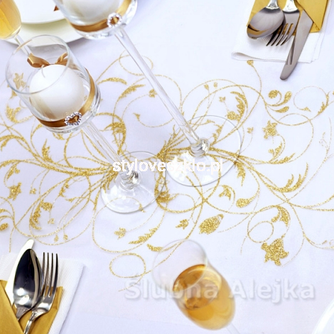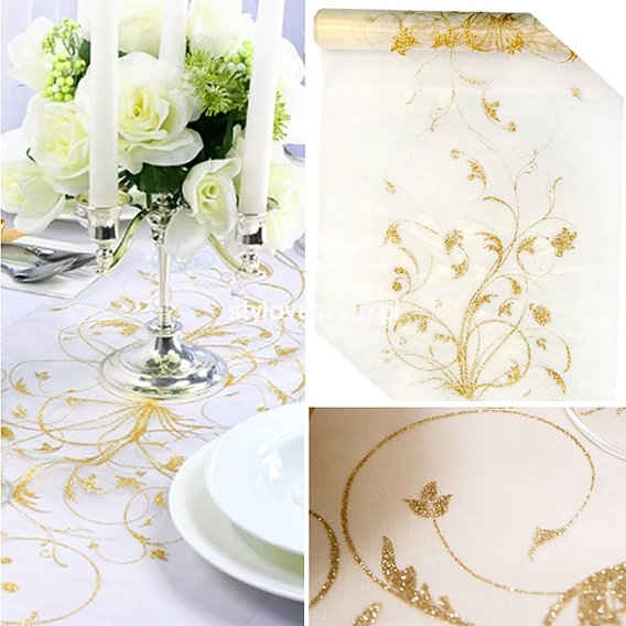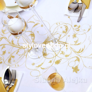 Bieżnik złoty jest bardzo delikatną ozdobą stołu, wykonaną z materiału typu organza ze złotym wzorem florystycznym, wijącym się przez całą długość bieżnika złotego. Znakomicie sprawdza się na długich stołach bankietowych w restauracjach, hotelach i kawiarniach. Subtelnie podkreśla aranżację stołu, dodając mu szyku i stylu. Jest jednocześnie osią całego nakrycie i to z reguły na bieżniku stawiane są potrawy główne, zatem jego wygląd ma ogromne znaczenie.