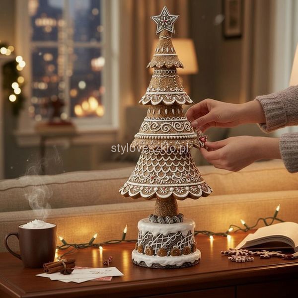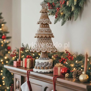 Choinka z piernika może uzupełniać większą aranżację świąteczną, szczególnie jeśli tak samo jak ona reprezentuje styl glamour. Znakomicie pasuje również do dużych stroików i przestrzennych świeczników. Można ją wówczas osadzić wśród gałązek świerkowych, bombek i innych świątecznych elementów dekoracyjnych.