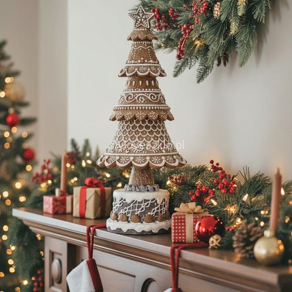 Choinka Świąteczna z Piernika to elegancki dodatek dekoracyjny w czasie świąt Bożego Narodzenia w szczególności. Bogate zdobienia - obsypane lekko brokatem pięknie zdobią choinkę, która z powodzeniemrozgości się na stołach, komodach i recepcji w hotelach, restauracjach, czy kawiarniach. Naturalny wygląd podkreśla magiczny charakter Bożego Narodzenia.