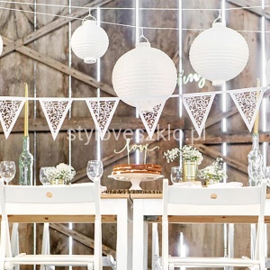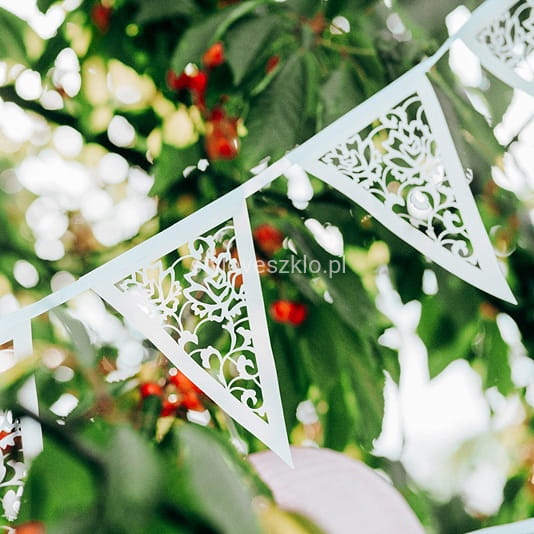 Girlanda weselna ażurowa to łańcuch stworzony z wyciętych, białych, ażurowych trójkątów, które razem tworzą oryginalną ozdobę ślubną. Najpopularniejszym zastosowaniem tej girlandy jest podwieszenie jej pod sufitem namiotu weselnego. Tworzy wówczas przestrzenną instalację, którą można podświetlić wielobarwnymi halogenami, zmieniając z minuty na minutę atmosferę z romantycznej na rockową. Girlandę można umieścić również nad wejściem do restauracji, a nawet wzdłuż nawy głównej w kościele. Z pewnością doda lekkości i elegancji każdemu pomieszczeniu. Należy jednak zwracać uwagę na delikatny materiał, z jakiego wykonana jest girlanda i zachować ostrożność zarówno przy montażu, jak i demontażu ozdoby.