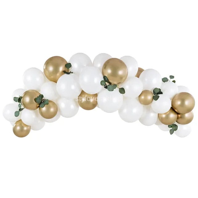 Biało-złota girlanda balonowa, zestaw zawiera 60 balonów (49 pastelowe w kolorze białym i 11 Glossy w kolorze złotym) i ok. 2.5 m taśmy do girland balonowych. Instrukcja w zestawie.