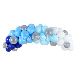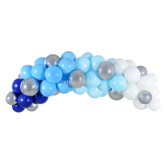 Niebieska girlanda balonowa, zestaw zawiera 60 balonów (10 Glossy w kolorze srebrnym, 10 pastelowych w kolorze granatowym, 10 pastelowych w kolorze Light Blue, 17 pastelowych w kolorze błękitnym i 13 pastelowych w kolorze białym) i ok. 2.5 m taśmy do girland balonowych. Instrukcja w zestawie