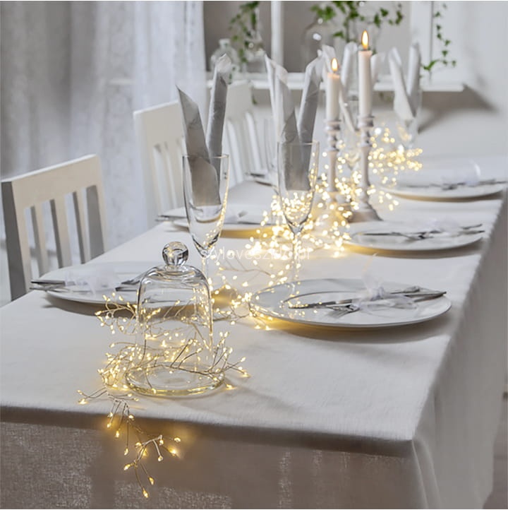 Lampki drucik świetlny Ryż można umieścić na stołach pośród zastawy razem z inną delikatną dekoracją, ale można też włożyć je do wysokiego, szklanego naczynia, tworząc w ten sposób stroik. Dodatkowo możemy je wplatać pomiędzy elementy aranżacyjne w dowolnym miejscu, podkręcając efekt końcowy dodatkowym oświetleniem.