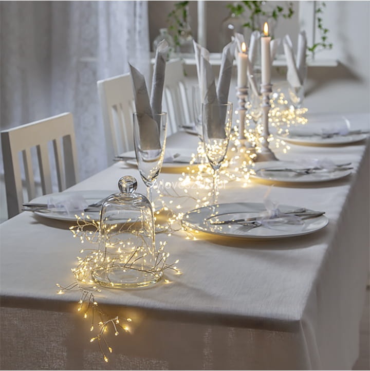 Lampki drucik świetlny Ryż można umieścić na stołach pośród zastawy razem z inną delikatną dekoracją, ale można też włożyć je do wysokiego, szklanego naczynia, tworząc w ten sposób stroik. Dodatkowo możemy je wplatać pomiędzy elementy aranżacyjne w dowolnym miejscu, podkręcając efekt końcowy dodatkowym oświetleniem.