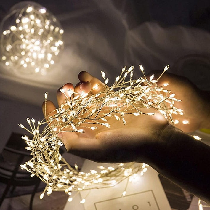 Lampki drucik świetlny Ryż to maleńkie lampki osadzone na cienkim druciku z bocznymi drucikami na których również są lampki. Zasilane na prąd Lampki MicroLED mają dość długi czas palenia. Ze względu na wygodę w użytkowaniu i brak konieczności podłączania ich do prądu - zyskują na popularności każdego dnia. Szczególnie praktyczne zastosowanie mają w hotelach i restauracjach. Wystarczy wybrać miejsce do umieszczenia lampek - drucika świetlnego, nie oglądając się na logistyką konieczną w przypadku lampek podłączanych do prądu.