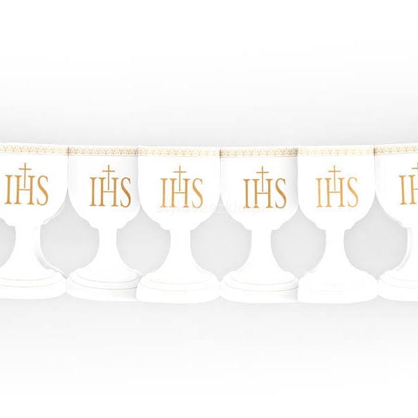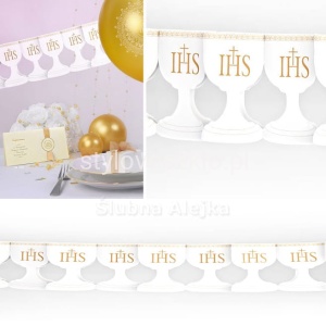 Delikatna biała girlanda komunijna w kształcie białych kielichów ze złotymi dodatkami i napisami IHS. Idealna na przyjęcie z okazji I Komunii Świętej.