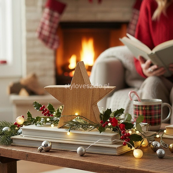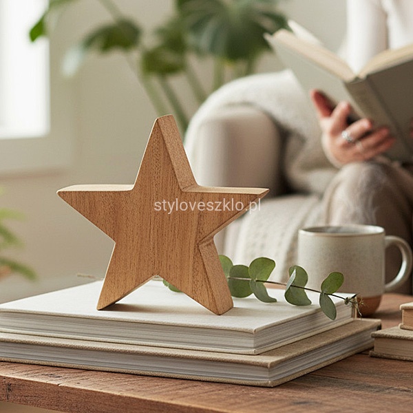 Gwiazdka drewniana może uzupełniać większą aranżację świąteczną, szczególnie jeśli tak samo jak ona reprezentuje styl skandynawski, minimalistyczny lub rustykalny. Znakomicie pasuje również do dużych stroików i przestrzennych świeczników. Można ją umieścić wśród gałązek świerkowych, bombek i innych świątecznych elementów dekoracyjnych. Wysokość 10 cm, grubość 4 cm.