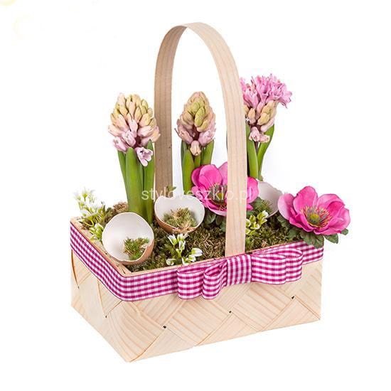 Mały, lekki koszyk, który pomieści wielkanocne jajeczka, kwitnące hiacynty lub inne dekoracje wielkanocne. Wykonana w nim kompozycja ze świeżych pierwiosnków, tulipanów, czy żonkili wniesie prawdziwy powiew wiosny do restauracji, czy domu. Wspaniały pomysł na niezobowiązujący prezent.
