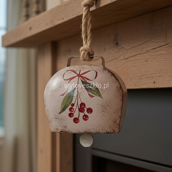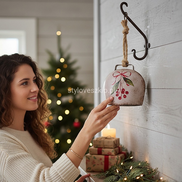 Dzwonek metalowy z gałązką świąteczną jest ozdobą, która fantastycznie komponuje się z kominkiem, wiankiem bożonarodzeniowym i naturalnym drewnem. Z uwagi na kolorystykę znajdzie swoje miejsce w każdej stylizacji świątecznej. W towarzystwie innych zawieszek, pachnących gałęzi świerku i choinki wspaniale zdobi wnętrze domu lub restauracji w czasie świątecznych kolacji.