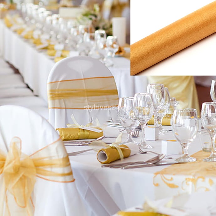 Oferujemy Państwu piękną, gładką organzę snow w kolorze złotym. Organza nie jest obszyta na brzegach. Brzegi organzy cięte są techniką „na ciepło”, więc organza nie strzępi się. Materiał uświetni każdą uroczystość ślubną i wesele, dzięki swojej połyskliwej strukturze. Można wykorzystać ją do owinięcia kolumn, barierek, a nawet krzeseł. Wszystko to sprawia, że gładka organza jest uniwersalną dekoracją o praktycznym zastosowaniu. Drapowana może stanowić nawet oryginalną ozdobę na stole weselnym. Ponadto jest fantastyczną podstawą do stworzenia kompozycji florystycznych. Można nią również wyłożyć wolną przestrzeń między latarenkami lub świecznikami. Wówczas delikatne światło świecy odbijając się w gładkim materiale będzie tworzyć romantyczną iluminację.