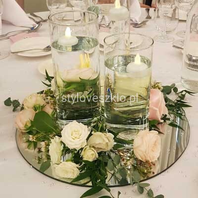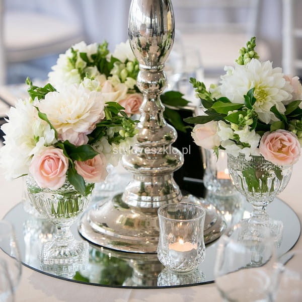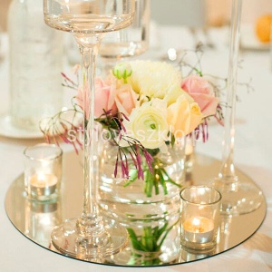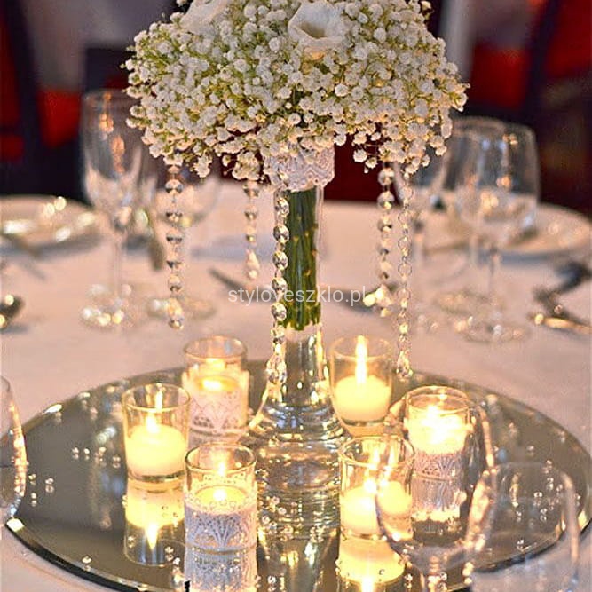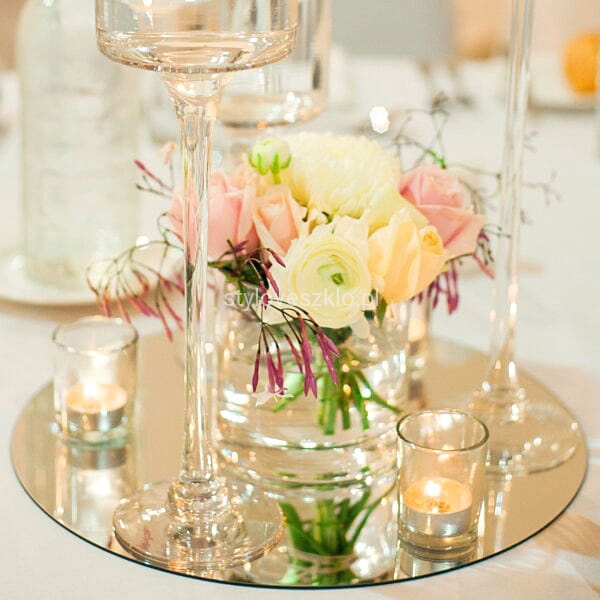 Podstawka pod świecę wykonana z ciętego lustra w kształcie koła. Chroni przed gorącym woskiem, a jednocześnie podkreśla urok całej aranżacji pięknie odbijając światło. Na podstawkę można rozsypać małe, diamentowe konfetti aby podkreślić efekt. Idealnie nadaje się na centralną dekorację stołu w lokalu i każdym innym wnętrzu.