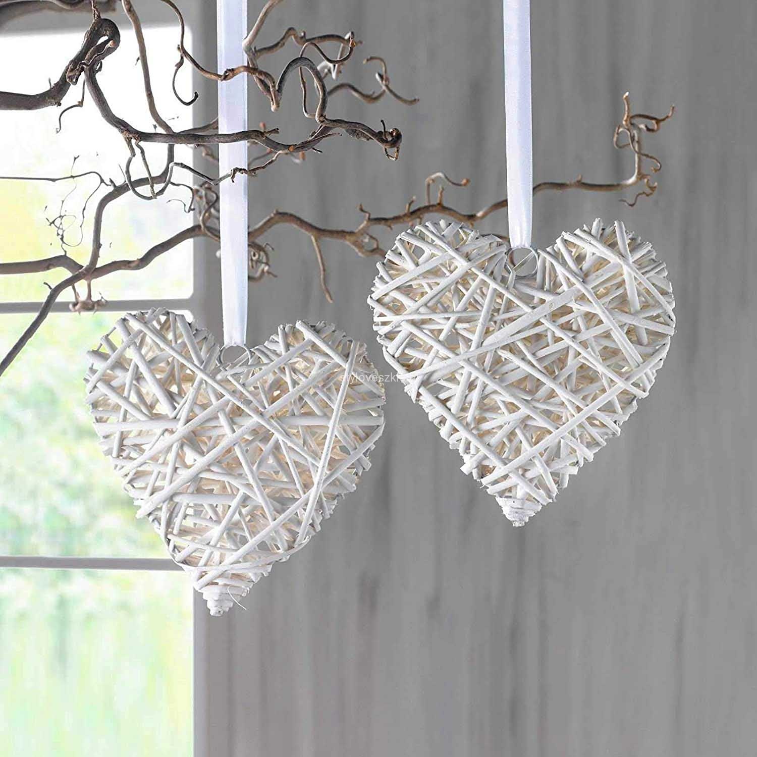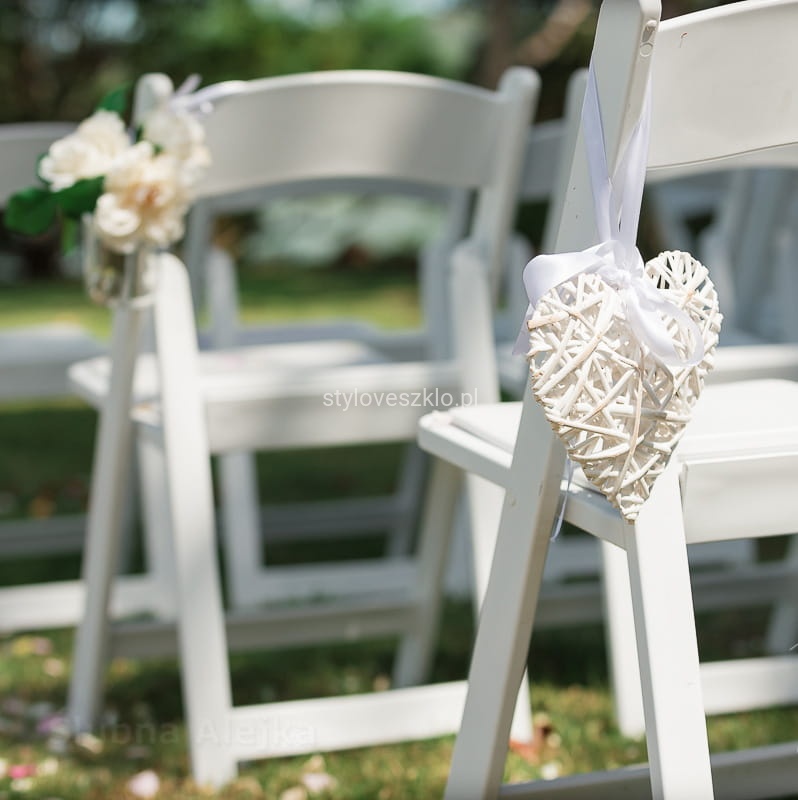 Oferujemy Państwu duże serce wykonane z białej wikliny, które jest znakomitą ozdobą ślubną zarówno w kościele, jak i sali weselnej. Dzięki dołączonej białej wstążce można je zawiesić w dowolnym miejscu, choć najpopularniejszym miejscem na tego typu dekorację jest zwykle siedzenie Państwa Młodych. Potrafi jednak pięknie ozdobić salę weselną w każdym innym miejscu, na przykład w Candy Barze. Jest to również idealna baza dekoracyjna dla kwiatów, światełek czy tasiemek. Bardzo łatwo również przebiega montaż, ponieważ wystarczy do tego ozdobna tasiemka lub żyłka.