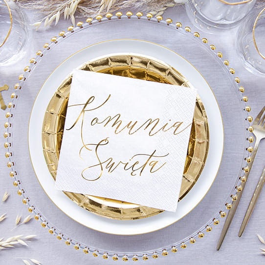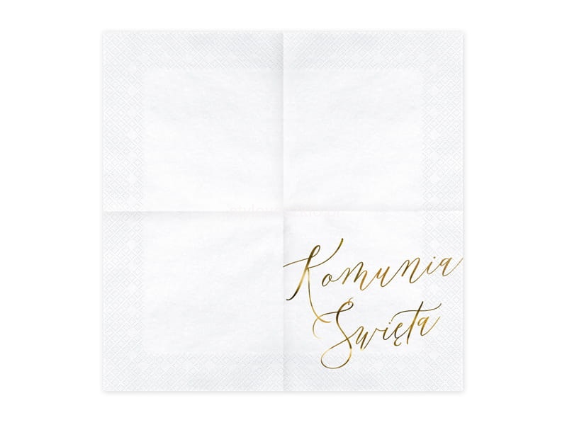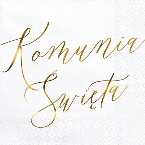 Serwetki komunijne papierowe 3 warstwowe ze złotym napisem "Komunia Święta". Można skompletować z nimi girlandy i toppery komunijne, które pięknie podkreślą uroczyste chwile podczas przyjęcia komunijnego.
