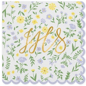 Piękne serwetki komunijne 3 warstwowe z z pięknym wielokolorowym wzorem i złotym napisem IHS. Do wykorzystania na każdym uroczystym przyjęciu komunijnym.