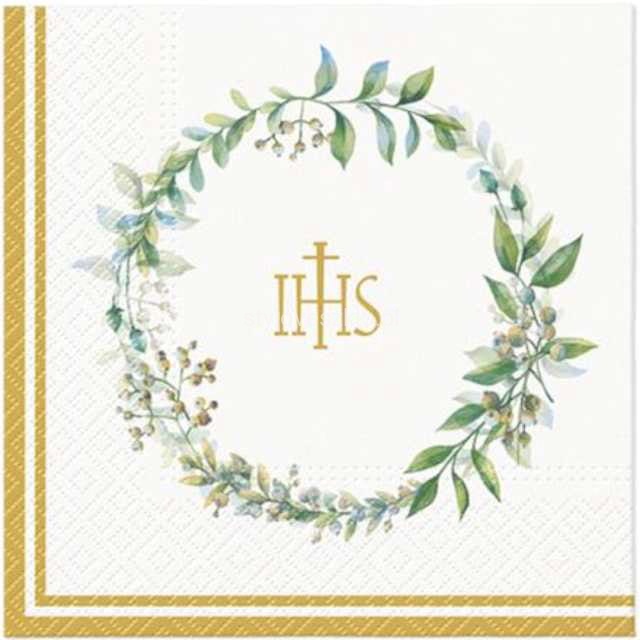 Piękne serwetki komunijne 3 warstwowe z z pięknym zielonym wianuszkiem i złotym napisem IHS. Do wykorzystania na każdym uroczystym przyjęciu komunijnym.