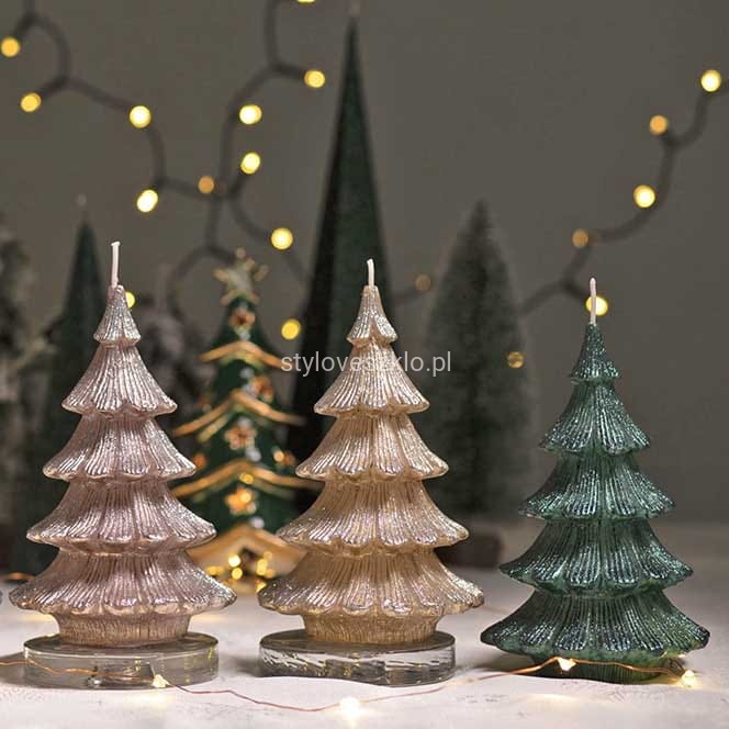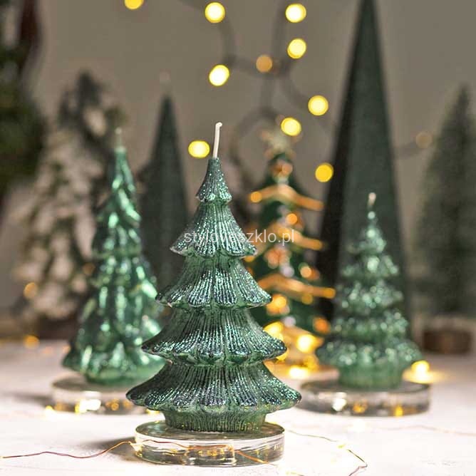 Świeca ozdobna Figurka Choinka Ciemnozielona to bardzo elegancka świeca pasująca do każdego stylu. Delikatnie obsypana brokatem, który pięknie lśni przy zapalonych świecach. Zwróci uwagę na każdym eleganckim stole. Przepiękne kolory dodadzą z pewnością dodadzą przytulnego świątecznego klimatu. W salonie, sypialni, czy podczas przyjęcia – świece ozdobne sprawdzą się w każdej z tych aranżacji. W połączeniu z dostępnymi w naszym sklepie szklanymi lampionami oraz dekoracyjnym piaskiem, stworzy prostą, ale zarazem bardzo ubogacającą wnętrze dekorację.