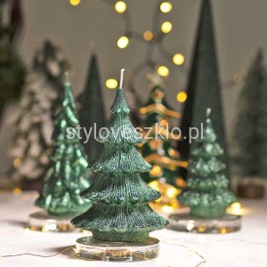 Świeca ozdobna Figurka Choinka Ciemnozielona to bardzo elegancka świeca pasująca do każdego stylu. Delikatnie obsypana brokatem, który pięknie lśni przy zapalonych świecach. Zwróci uwagę na każdym eleganckim stole. Przepiękne kolory dodadzą z pewnością dodadzą przytulnego świątecznego klimatu. W salonie, sypialni, czy podczas przyjęcia – świece ozdobne sprawdzą się w każdej z tych aranżacji. W połączeniu z dostępnymi w naszym sklepie szklanymi lampionami oraz dekoracyjnym piaskiem, stworzy prostą, ale zarazem bardzo ubogacającą wnętrze dekorację.