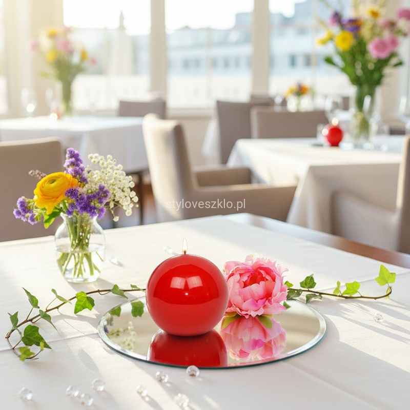 Świeca kula lakierowana pięknie prezentuje się na wysokich szklanych świecznikach. Wówczas stanowi główną dekorację stołów w czasie przyjęć organizowanych w naszej restauracji, hotelu i kawiarni. Może również stanowić podstawę do stworzenia stroika świątecznego, noworocznego, karnawałowego, weselnego i codziennego. Świecę kulę lakierowaną łatwo dopasować do otaczającej aranżacji, głównie ze względu na szeroki wachlarz kolorystyczny.