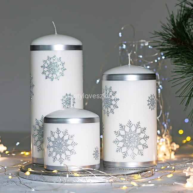 Świeca pieńkowa Stars to wyjątkowo elegancka świeca zdobiona uroczymi śnieżynkami. Ma gładką strukturę przez co bardzo wpisuje się w eleganckie wnętrza. Świeca jest w całości biała i pali się bardzo długo równym i jasnym płomieniem. Świeca z serii Stars to atrakcyjny dodatek do większych pomieszczeń, np. salonów i kuchni połączonych z jadalnią. Świece pieńkowe w srebrnym odcieniu idealnie sprawdzą się w czasie organizacji różnego rodzaju przyjęć. Kilka takich świec o różnej wysokości i średnicy bez żadnych dodatków potrafi uformować znakomitą dekorację.