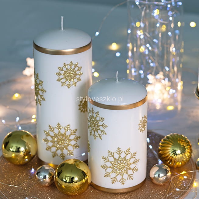Świeca pieńkowa Stars to wyjątkowo elegancka świeca zdobiona uroczymi śnieżynkami. Ma gładką strukturę przez co bardzo wpisuje się w eleganckie wnętrza. Świeca jest w całości biała i pali się bardzo długo równym i jasnym płomieniem. Świeca z serii Stars to atrakcyjny dodatek do większych pomieszczeń, np. salonów i kuchni połączonych z jadalnią. Świece pieńkowe w złotym odcieniu idealnie sprawdzą się w czasie organizacji różnego rodzaju przyjęć. Kilka takich świec o różnej wysokości i średnicy bez żadnych dodatków potrafi uformować znakomitą dekorację.