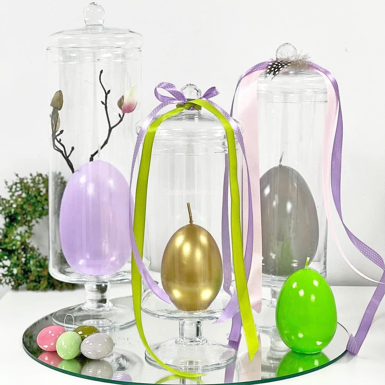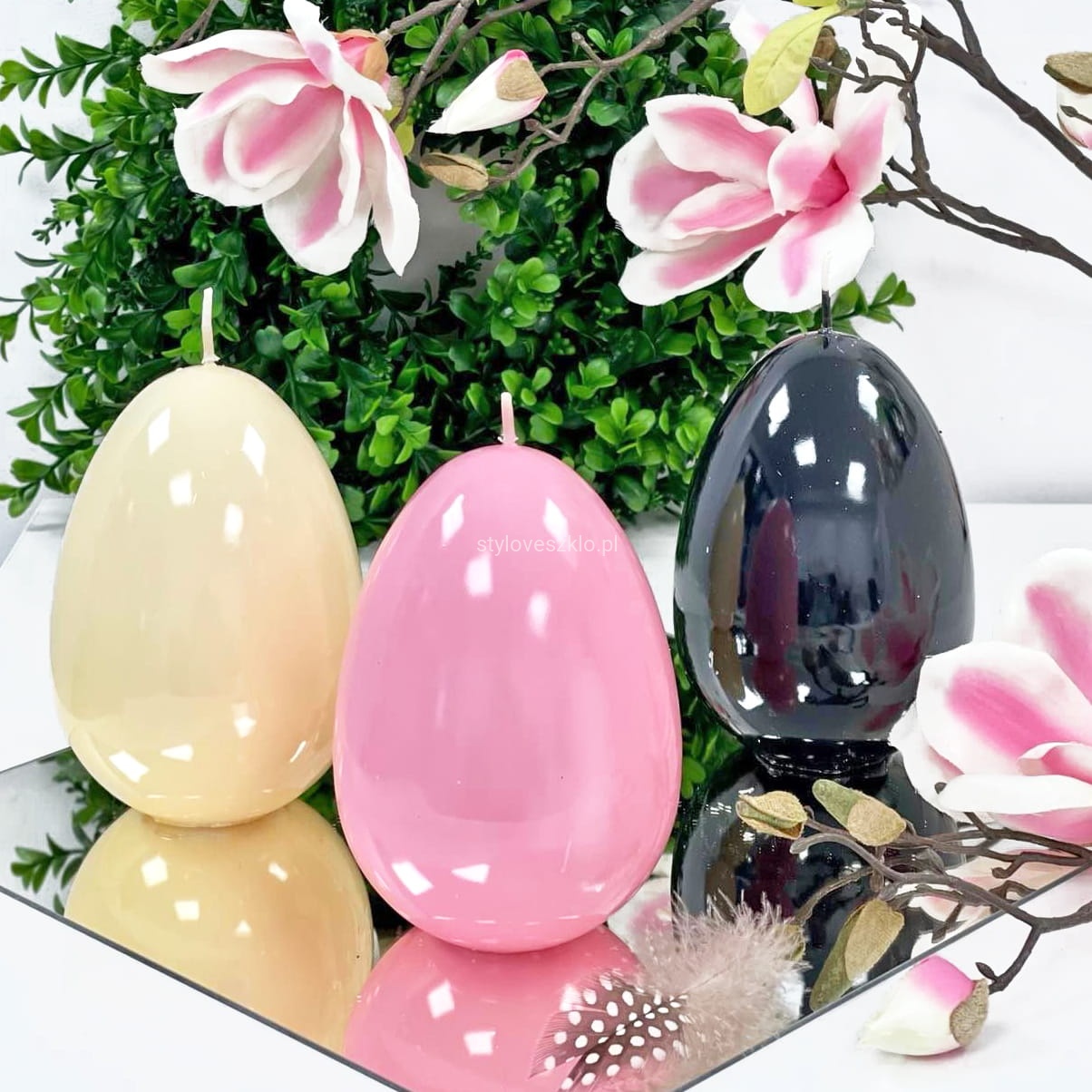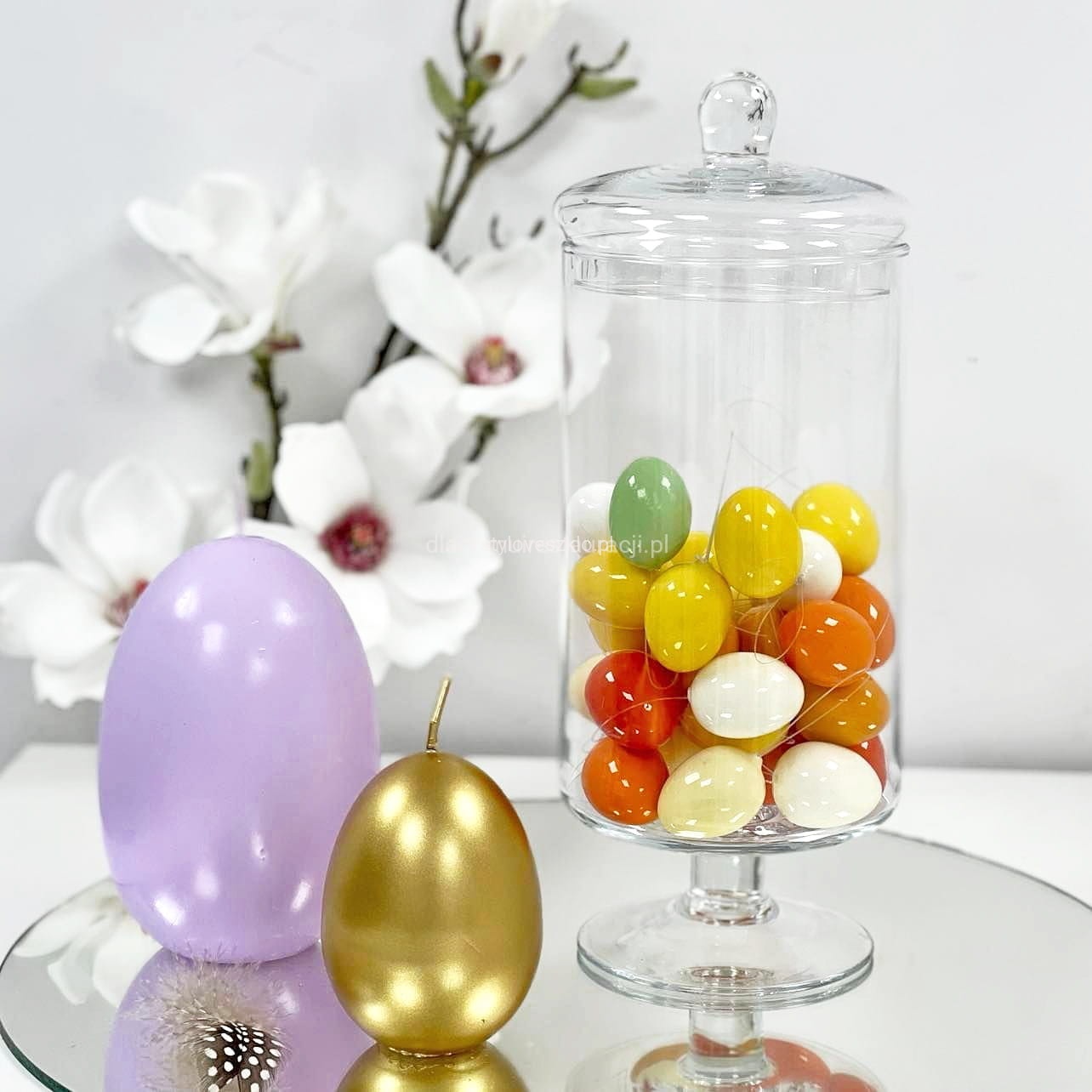 Świece wielkanocne jajka są idealne do dużych szklanych świeczników. Wówczas na dno wsypujemy ozdobny żwirek lub kamienie, dokładamy ozdobne trawy, piórka lub inne dekoracje. Gwarantujemy, że po ich zapaleniu stworzy się wspaniała atmosfera, a dekoracja zamieni się w ruchomy świetlny spektakl.