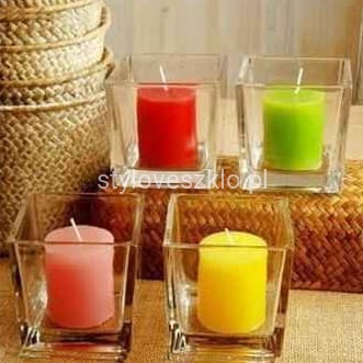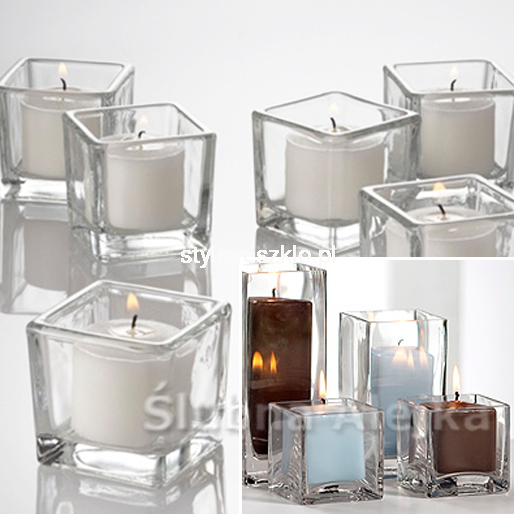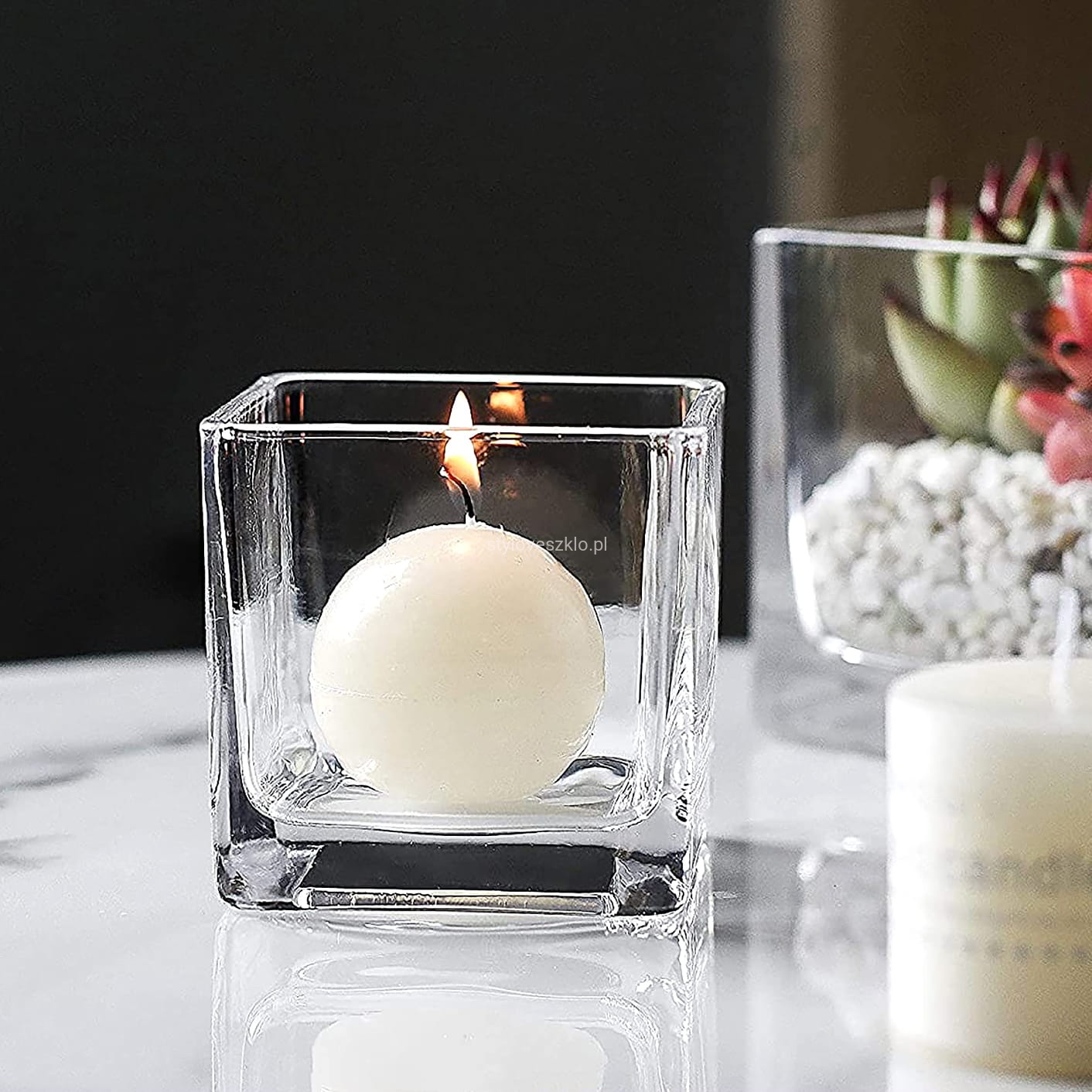 Świecznik szklany kostkę można wykorzystać na dwa sposoby. Z jednej strony możemy użyć go bez dodatkowych ozdób i porozstawiać w wybranych miejscach, tworząc punkty świetlne. Z drugiej strony możemy wpleść świecznik szklany kostkę w większą kompozycję. Z uwagi na to, że świecznik jest przezroczysty - wśród np. florystycznych dodatków będzie widoczny jedynie niewielki płomień.