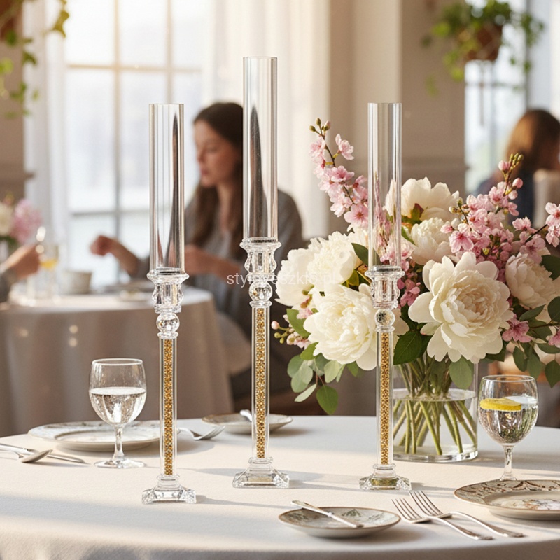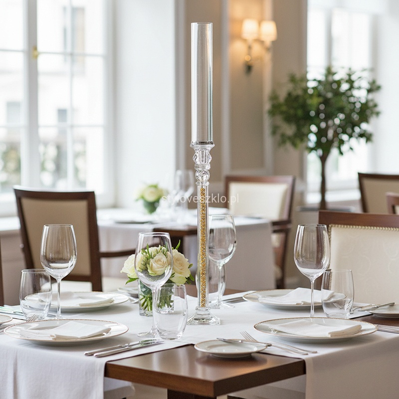 Świecznik szklany z kryształowym zdobieniem na nodze wpisuje się w kanon produktów luksusowych, które dzięki swojemu eleganckiemu designowi zdobią pomieszczenia w czasie wielu różnych uroczystości i przyjęć. Noga świecznika zdobionaa jest kryształowymi elementami i wypełniona jest w całości cyrkoniami. Świeczniki szklane, czy kryształowe to konieczne dodatki podczas ślubów, wesel, chrzcin i komunii. Są to dekoracje wdzięczne, klasyczne i mające ogromny potencjał. Można je wykorzystać zarówno w domu, jak i w restauracji, hotelu czy kawiarni.