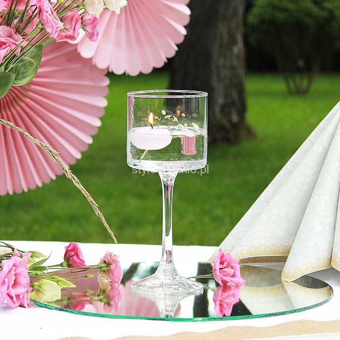 Zwykle świecznik szklany na nodze rozmieszczany jest symetrycznie na całej długości stołów. Wewnątrz świecznika, tuż obok świecy, można umieścić dodatkowe roślinne dekoracje. W naszej ofercie świeczniki mają różną wysokość, więc z powodzeniem możemy tworzyć z nich całe zestawy. Świecznik szklany na nodze można również aranżować, dopasowując go do pory roku, zbliżających się świąt lub wyjątkowych okazji.