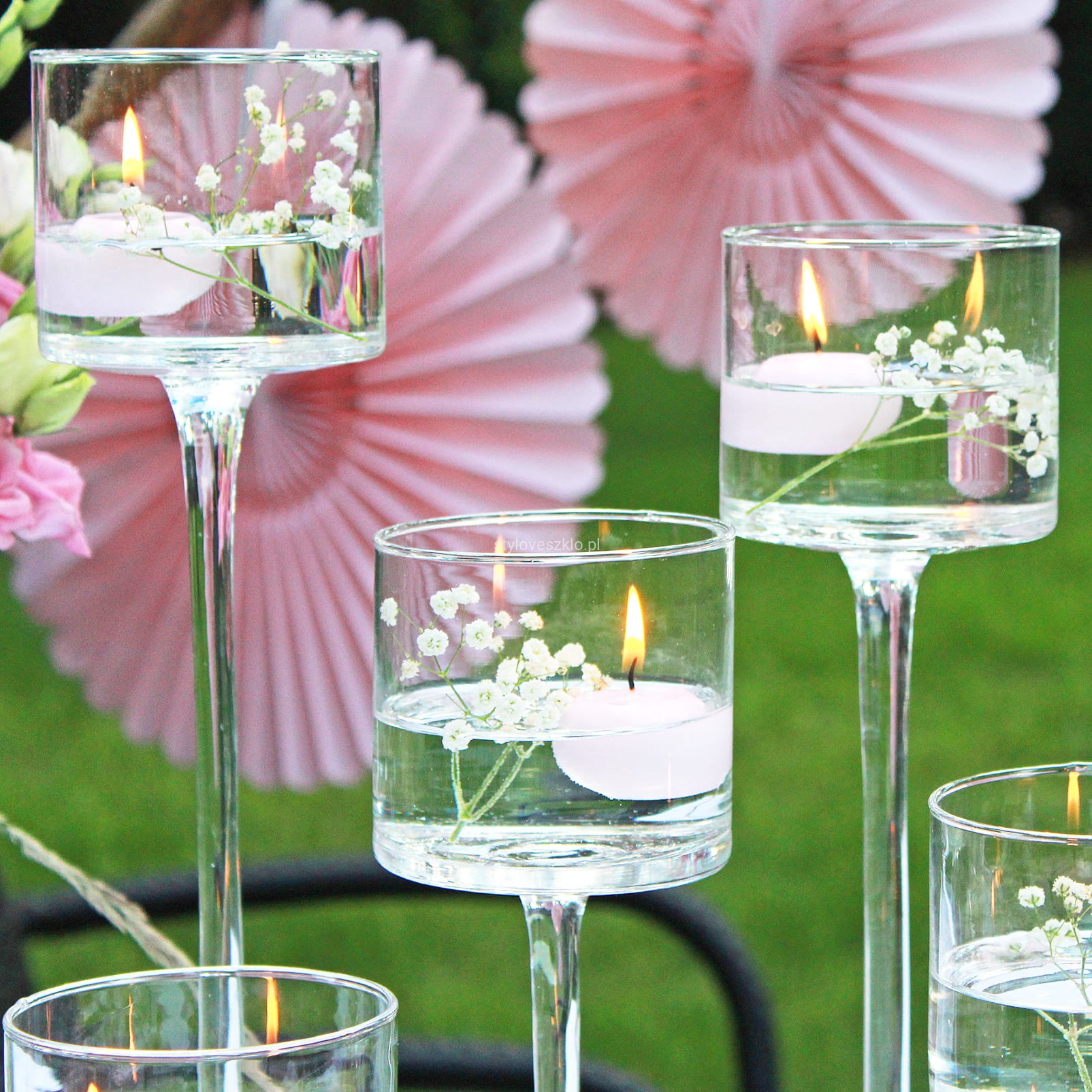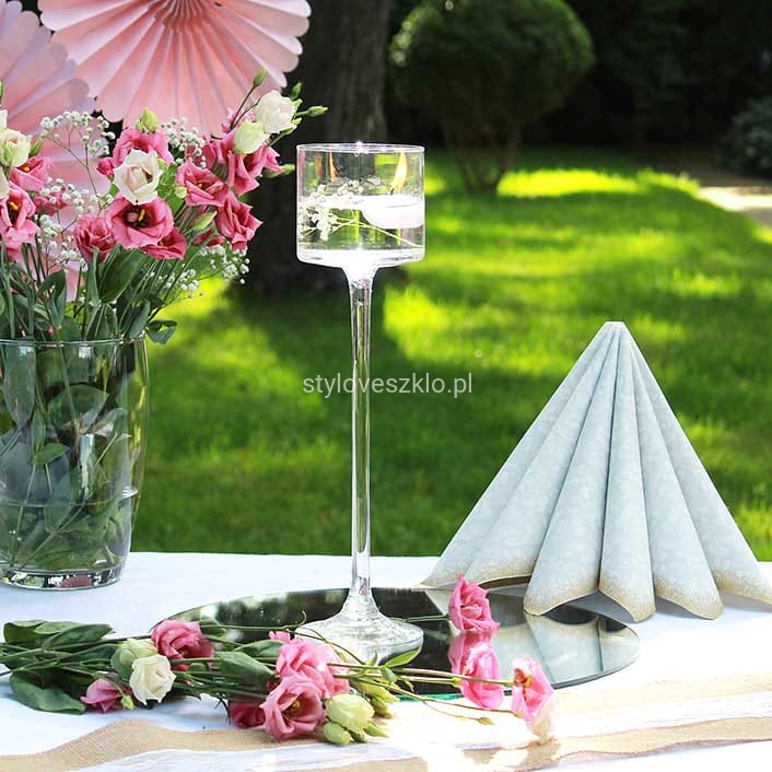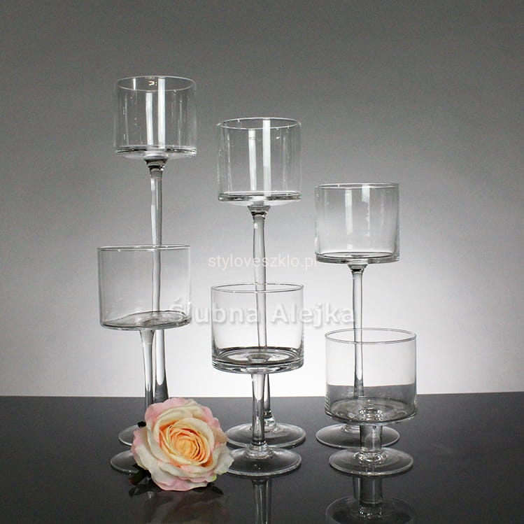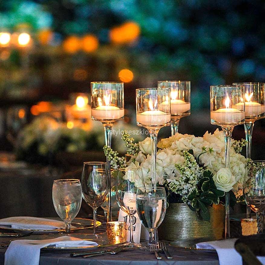 Zwykle świecznik szklany na nodze rozmieszczany jest symetrycznie na całej długości stołów. Wewnątrz świecznika, tuż obok świecy, można umieścić dodatkowe roślinne dekoracje. W naszej ofercie świeczniki mają różną wysokość, więc z powodzeniem możemy tworzyć z nich całe zestawy. Świecznik szklany na nodze można również aranżować, dopasowując go do pory roku, zbliżających się świąt lub wyjątkowych okazji.