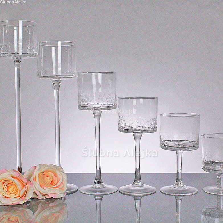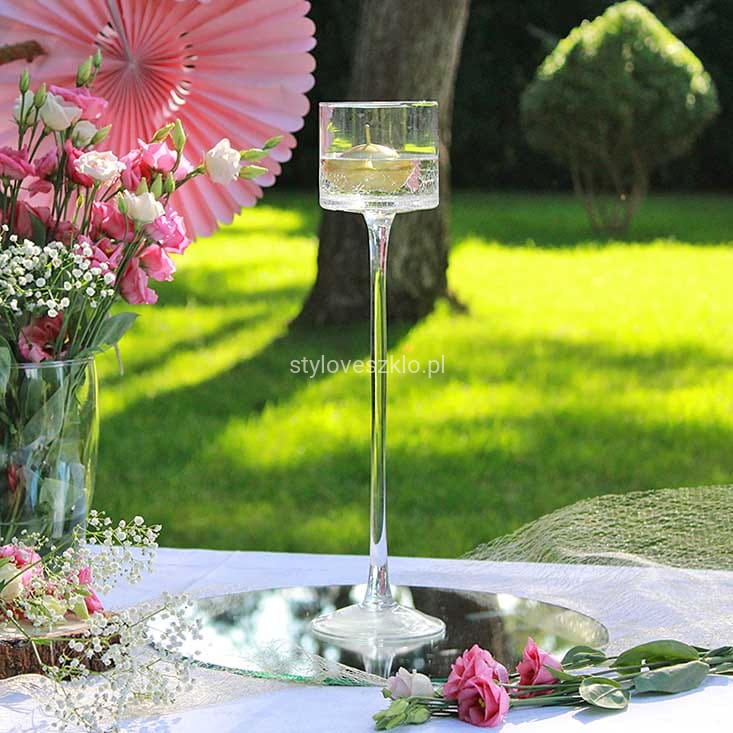 Świecznik szklany na nodze to elegancki i bardzo praktyczny w zastosowaniu element dekoracyjny. Cylindryczna czasza świecznika została osadzona na długiej, smukłej nóżce. Restauratorzy wykorzystują świecznik szklany na nodze jako lampiony wzdłuż całego stołu. Można zakupić je w hurtowych ilościach i ozdobić nimi całą restaurację, kawiarnię lub hotelowe lobby. Świecznik szklany na nodze wykonany jest z gładkiego lub mrożonego szkła.