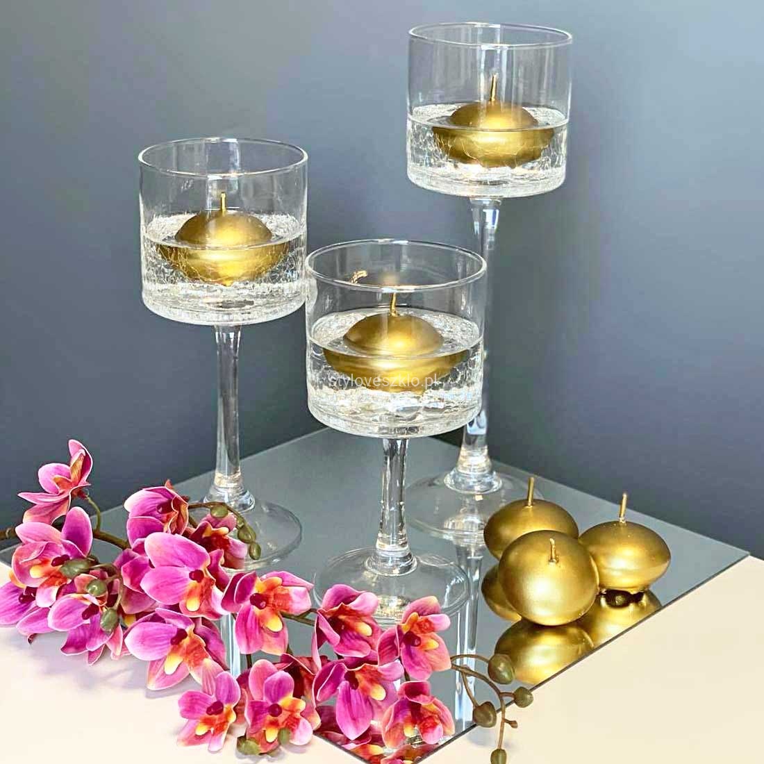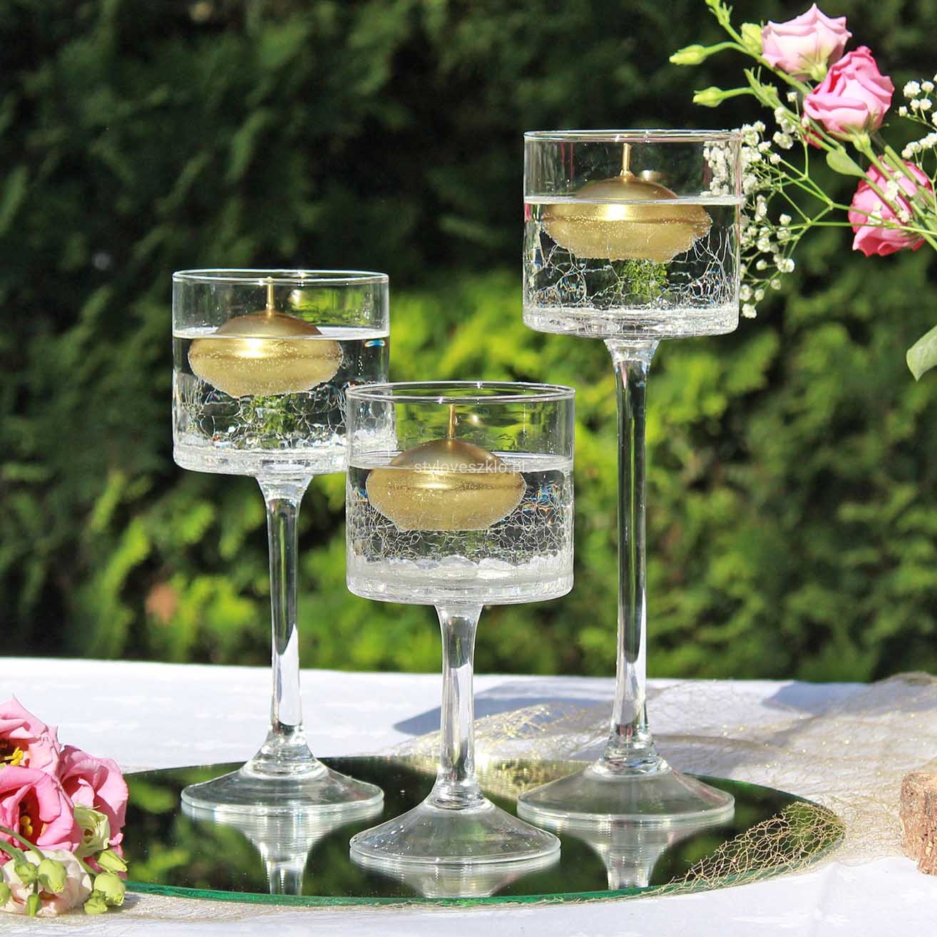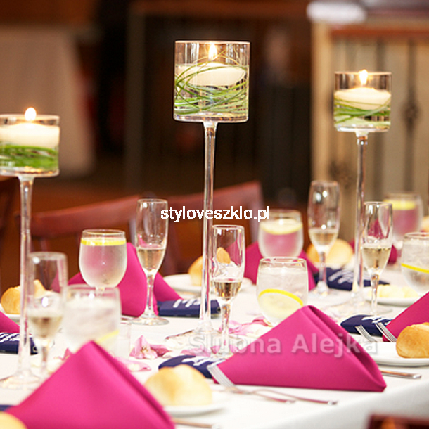 Zwykle świecznik szklany na nodze rozmieszczany jest symetrycznie na całej długości stołów. Wewnątrz świecznika, tuż obok świecy, można umieścić dodatkowe roślinne dekoracje. W naszej ofercie świeczniki mają różną wysokość, więc z powodzeniem możemy tworzyć z nich całe zestawy. Świecznik szklany na nodze można również aranżować, dopasowując go do pory roku, zbliżających się świąt lub wyjątkowych okazji.