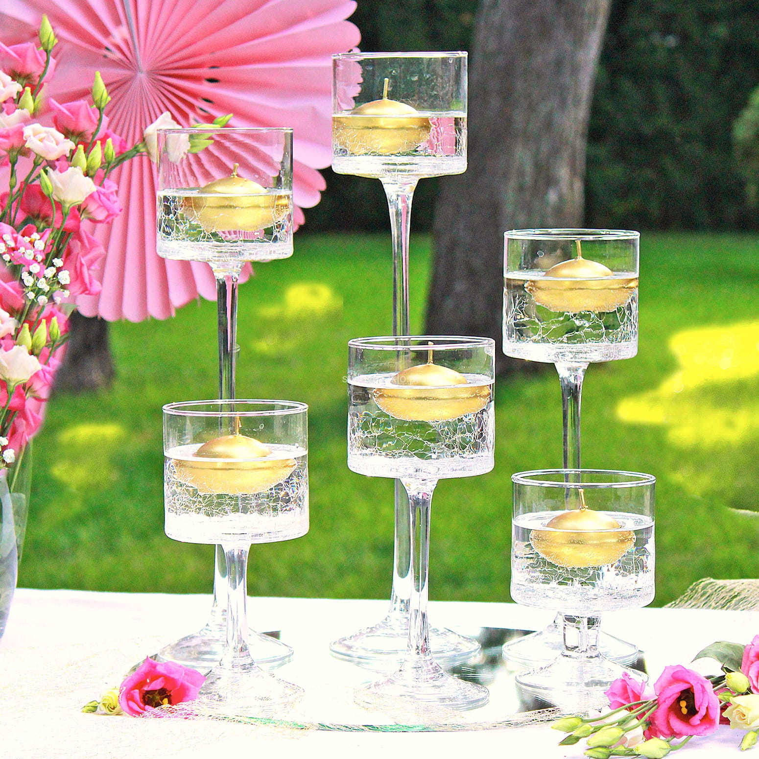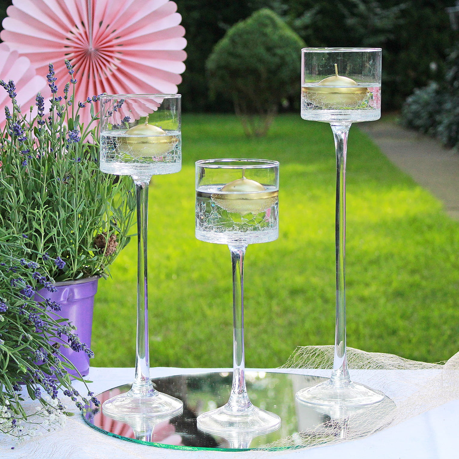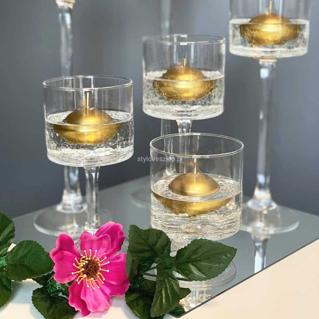 Zwykle świecznik szklany na nodze rozmieszczany jest symetrycznie na całej długości stołów. Wewnątrz świecznika, tuż obok świecy, można umieścić dodatkowe roślinne dekoracje. W naszej ofercie świeczniki mają różną wysokość, więc z powodzeniem możemy tworzyć z nich całe zestawy. Świecznik szklany na nodze można również aranżować, dopasowując go do pory roku, zbliżających się świąt lub wyjątkowych okazji.