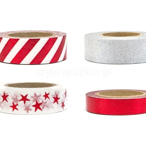 Taśma dekoracyjna papierowa, samoprzylepna (Washi tape) w kolorze srebrnym brokatowym, białym i czerwonym metalizowanym. Idealna do ozdabiania świec, świeczników lub innych elementów dekoracyjnych. Łatwa w użyciu. Tania i efektowna dekoracja w pięknych kolorach.