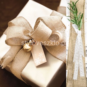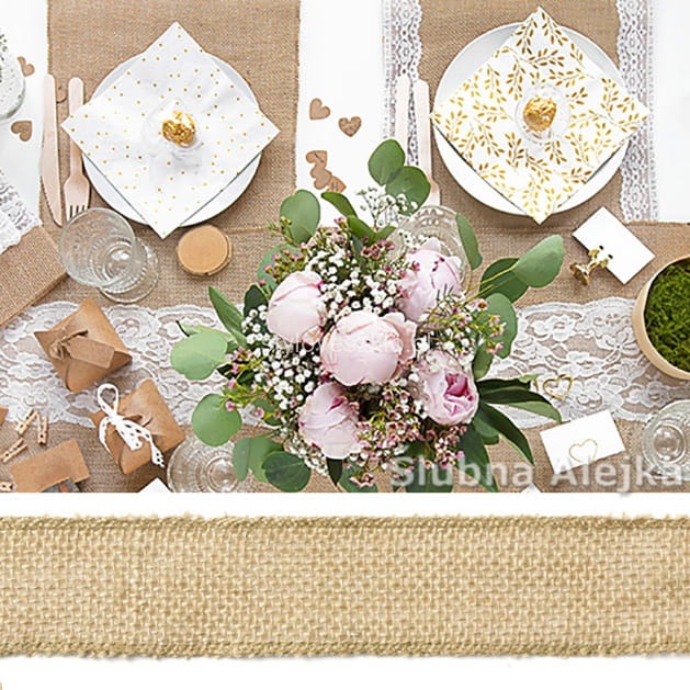 Taśma jutowa przypominająca wyglądem surowy len. To trwały materiał dekoracyjny, który sprawdzi się na długich weselnych lub świątecznych stołach. Taśma znakomicie uzupełnia aranżację stołu i nadaje elegancji całej uroczystości. Można ją dopasować do każdej zastawy stołowej, zarówno podczas ślubów, jak i uroczystości okolicznościowych. Prosta dekoracja w stylu vintage, która dobrze komponuje się z aranżacją zielonych sukulentów i drobnych, polnych kwiatków. Rolka jest wygodna w przechowywaniu i łatwa w zwijaniu.