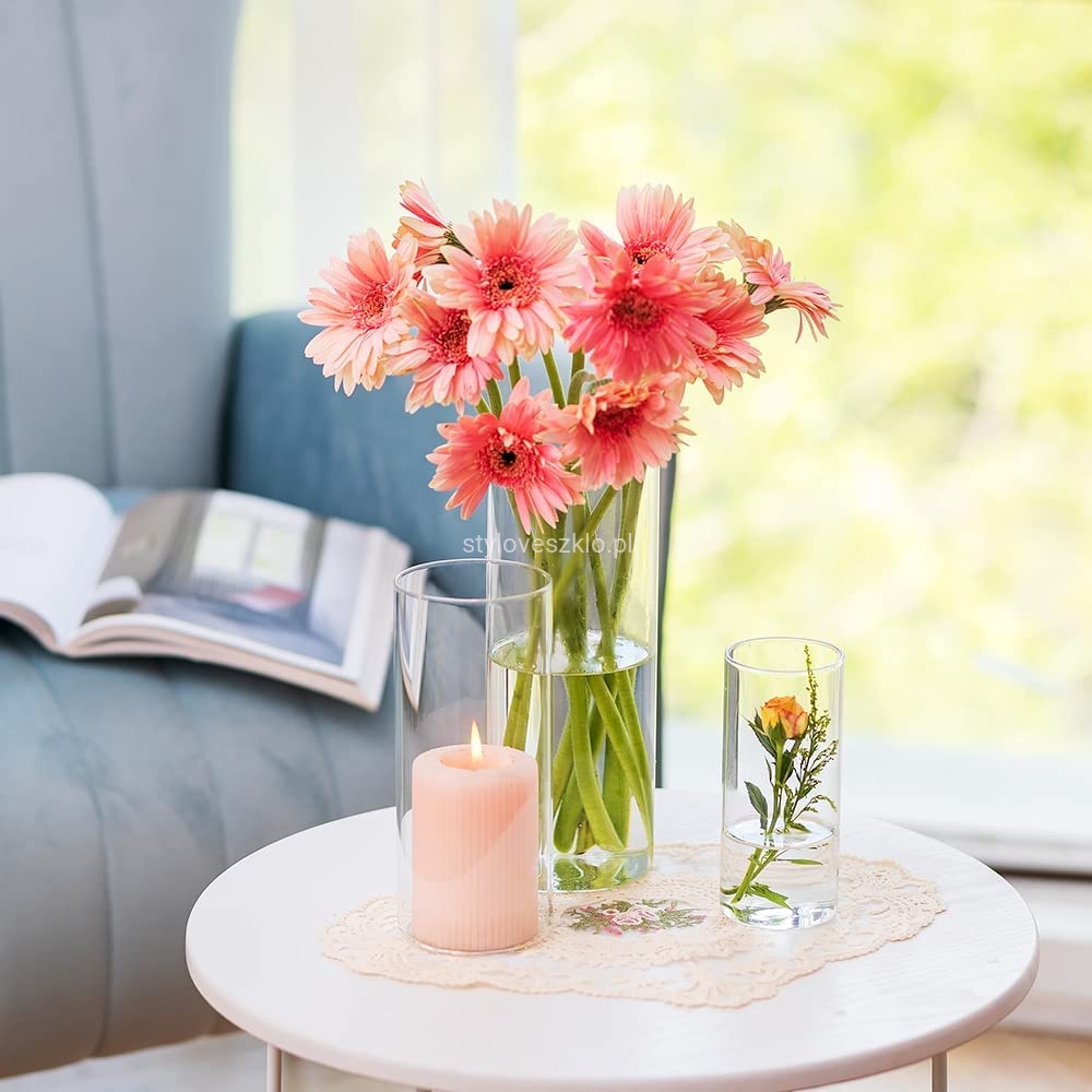 Wazon szklany cylinder jest wdzięcznym dodatkiem do dekoracji wnętrz w branży HoReCa. Długie kwiaty: róże, lilie, czy goździki, pięknie prezentują się w przezroczystym naczyniu nawet pojedynczo. Wnętrze wazonu można wypełnić również kolorowym piaskiem lub żwirem ozdobnym, tworząc warstwową dekorację stołów i komód.