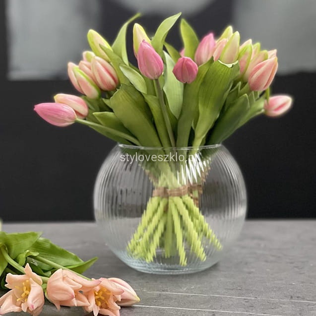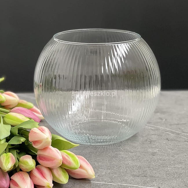 Wazon szklany Kula o średnicy 18 cm, wykonany ze szkła prążkowanego to minimalistyczna i wyrafinowana dekoracja weselna, bądź komunijna. Wnętrze szklanej kuli daje wiele możliwości aranżacyjnych. Kula znajduje swoje zastosowanie również w popularnych Candy Barach jako misa wypełniona kolorowymi bezami lub owocami. Pełni funkcję eleganckiego naczynia do losowania nagród. Kulista forma doskonale sprawdza się jako świecznik, wykorzystując świece wodne lub tradycyjne wkomponowane w piasek dekoracyjny, perły i kamyczki. Wazon jest stworzony do długich kwiatów o giętej łodydze takich jak kalie - pozwala łodygom opierać się o wewnętrzne ścianki wazonu - lub samych kielichów kwiatowych unoszących się na tafli wody niczym nenufary.