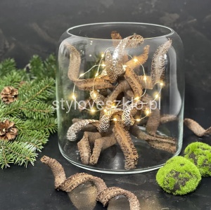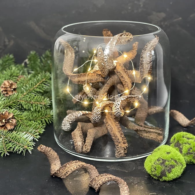 Wazon szklany można wypełnić trawami ozdobnymi, jak prezentują nasze fotografie, elementami dekoracji w stylu greenbells, kamieniami ozdobnymi oraz akcesoriami związanymi z danym sezonem: porą roku lub świętami. Duża średnica szyjki pozwala umieścić w nim przedmioty w różnych rozmiarach, a zatem dekoracja jest uniwersalnym i kreatywnym dodatkiem każdej aranżacji wnętrza.