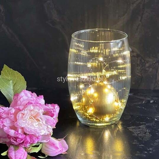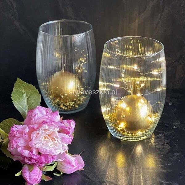 Wazon szklany można wypełnić trawami ozdobnymi, jak prezentują nasze fotografie, elementami dekoracji w stylu greenbells, kamieniami ozdobnymi oraz akcesoriami związanymi z danym sezonem: porą roku lub świętami. Duża średnica szyjki pozwala umieścić w nim przedmioty w różnych rozmiarach, a zatem dekoracja jest uniwersalnym i kreatywnym dodatkiem każdej aranżacji wnętrza.