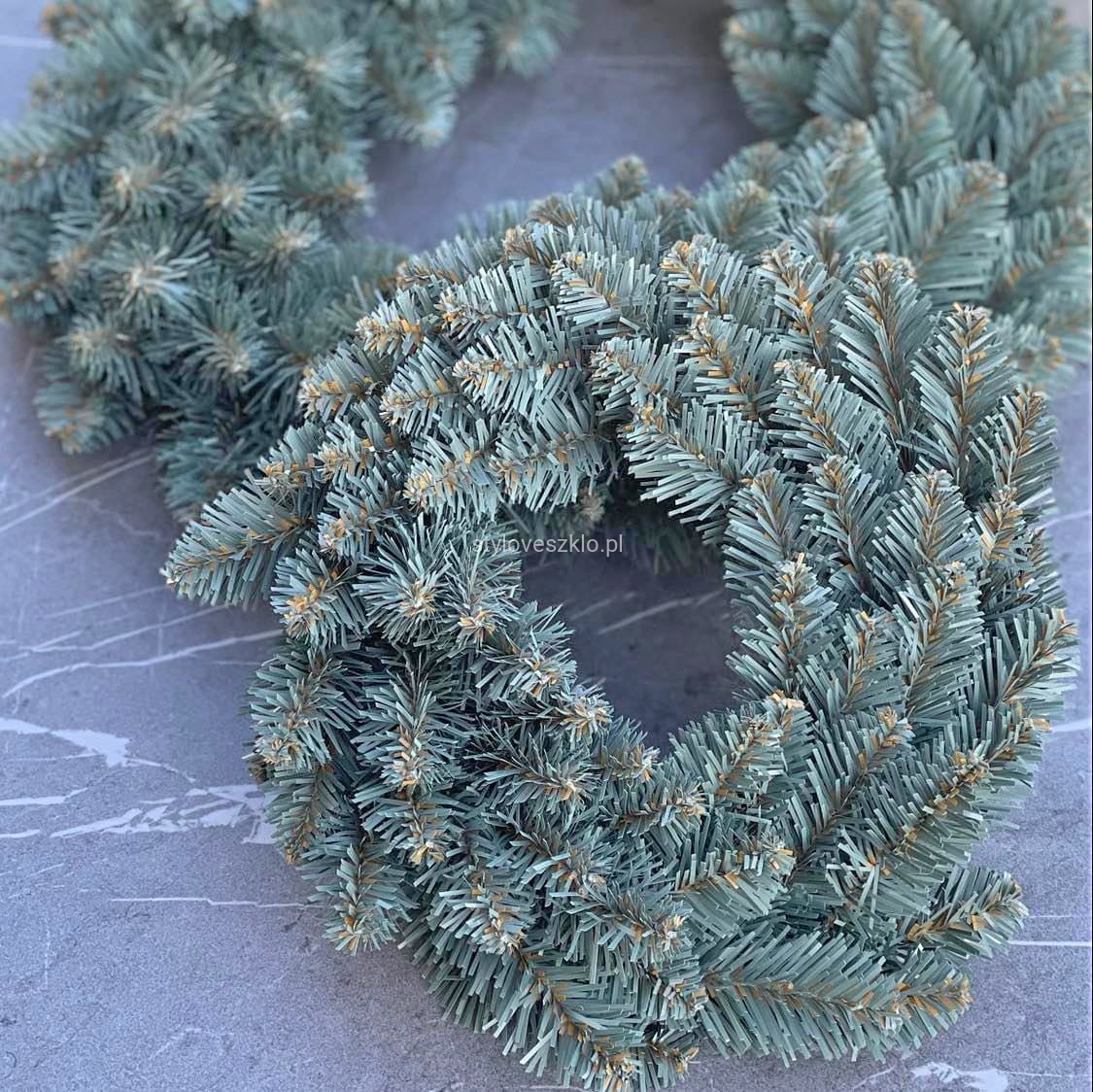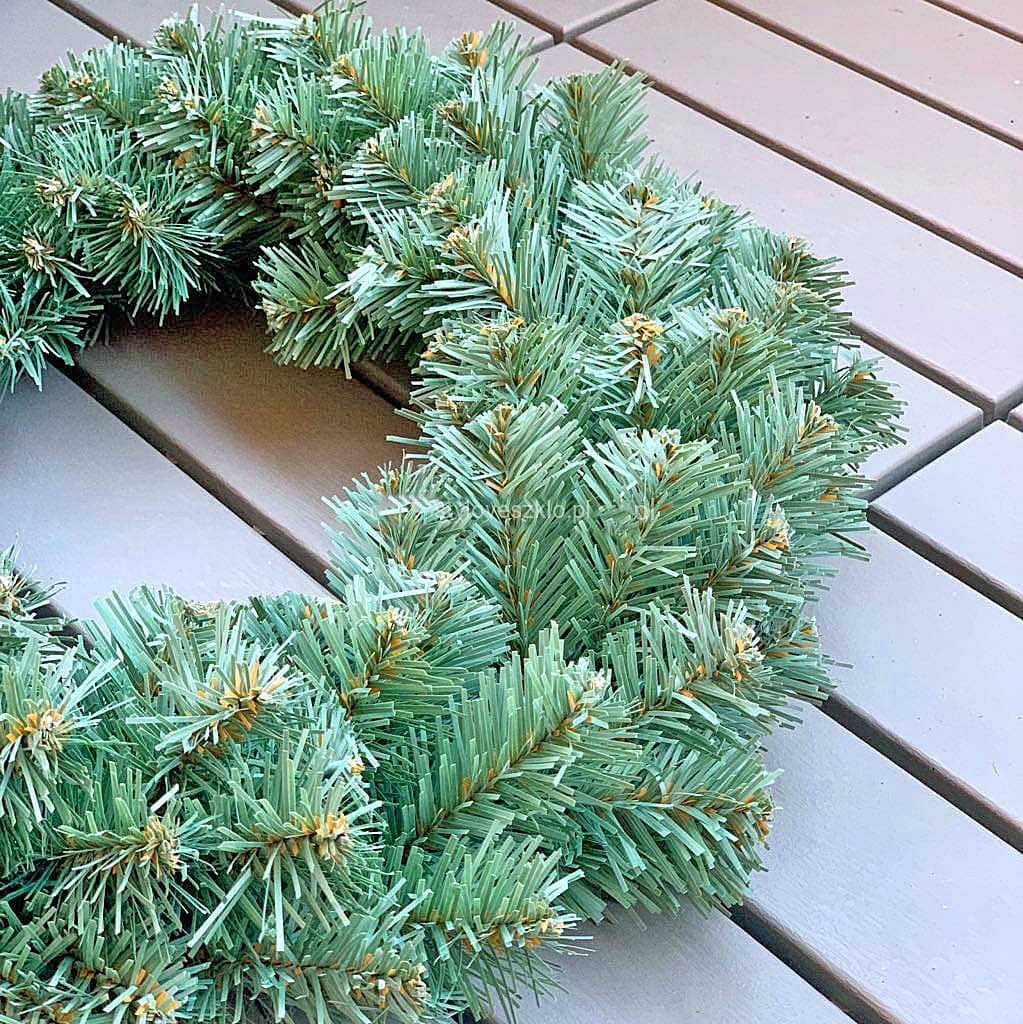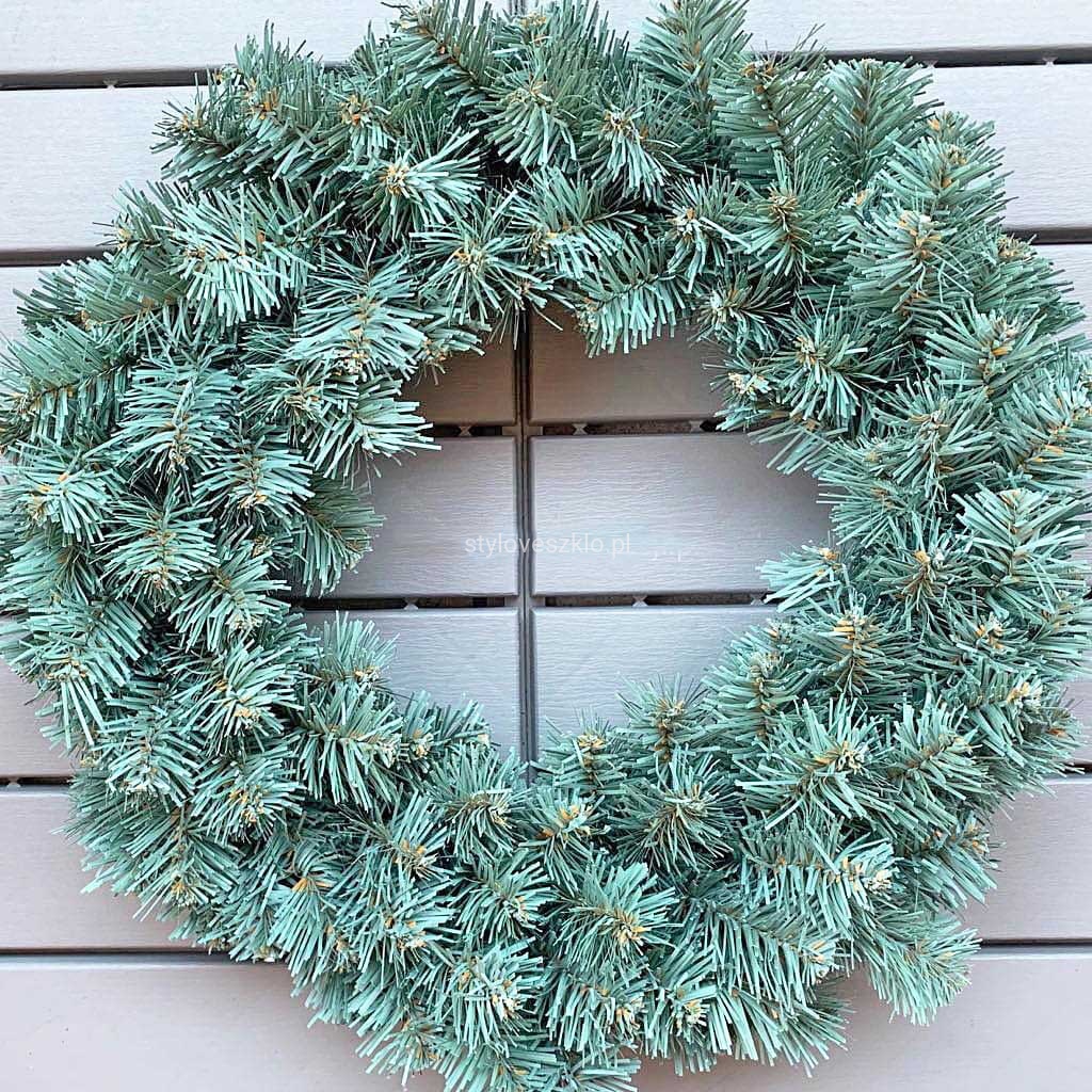 Piękny w swej prostocie wianek Kanadyjski Blue wykonany ze sztucznych gałązek srebrnego świerku.