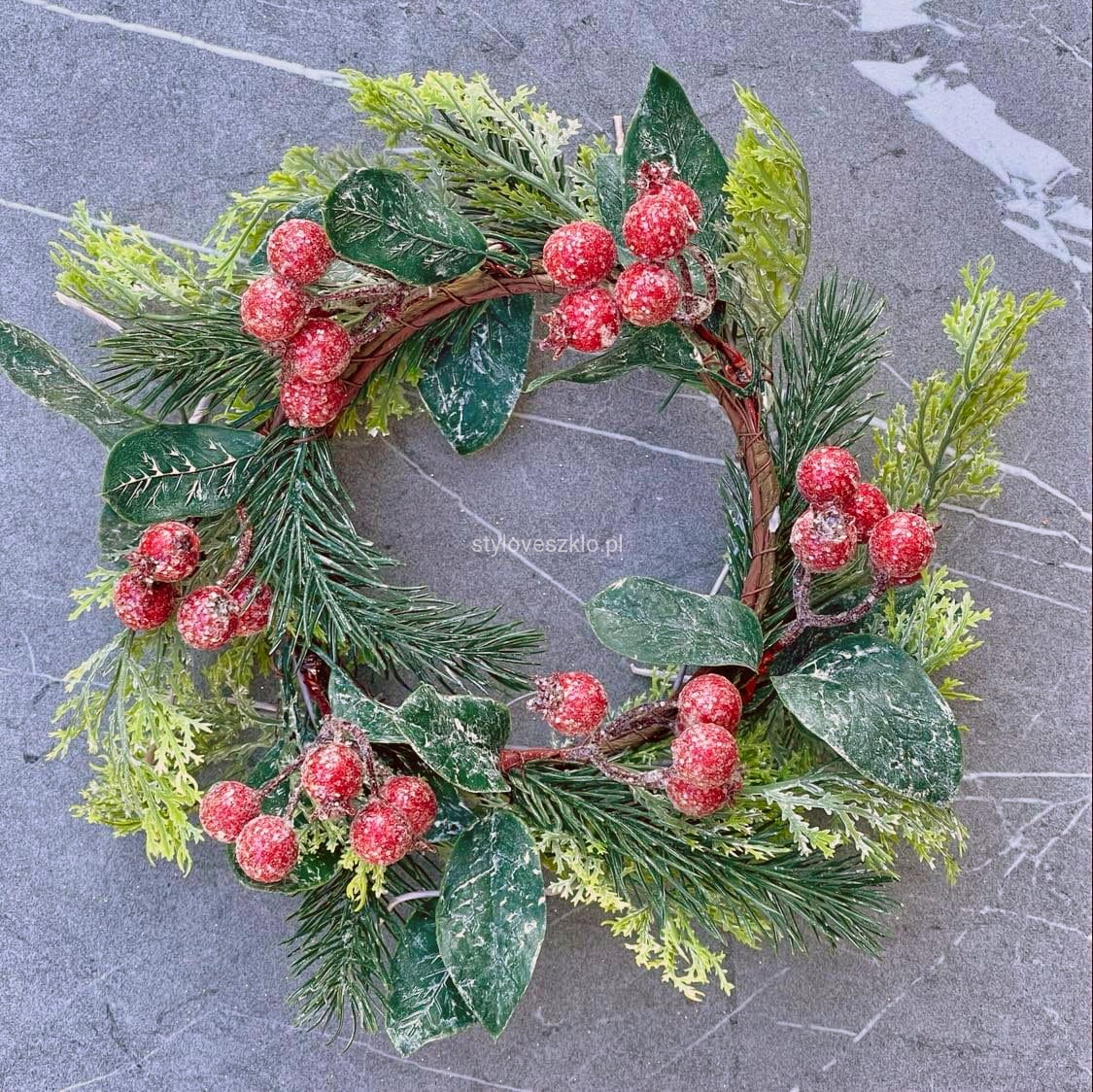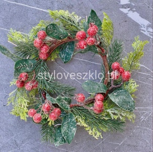 Wianek świąteczny z czerwonymi owocami wykonany ze sztucznego tworzywa do złudzenia przypominający naturalny świerk. Swoją popularność zyskał jako ozdoba okien w domowych czterech ścianach, jednak ze względu na swój sielski charakter wykorzystuje się go także jako ozdobna kościoła lub dekoracja świąteczny. Można zawiesić go na tasiemce i podwiesić zarówno w oknie sali restauracyjnej, jak i na ścianie, czy drzwiach – w wejściu do domu. W pozycji poziomej spełnia rolę jako stroik wokół lampionu lub świecznika.