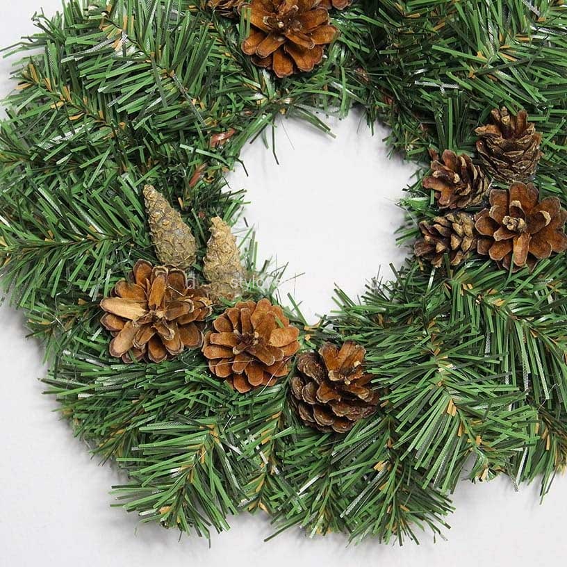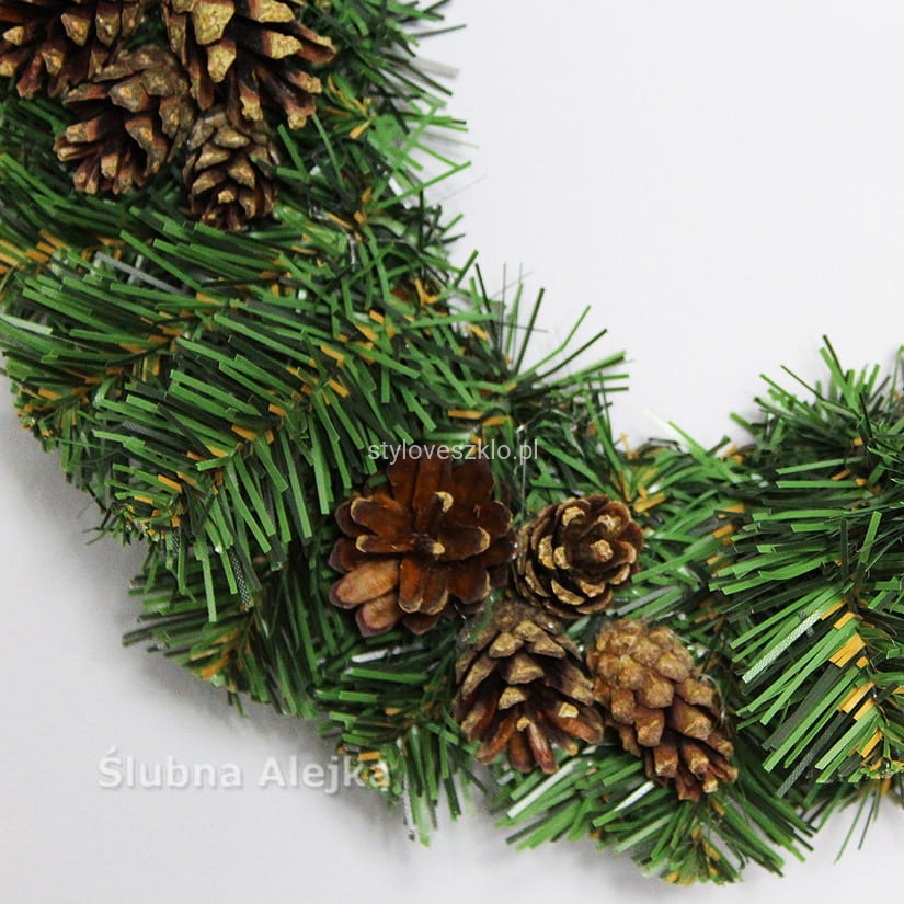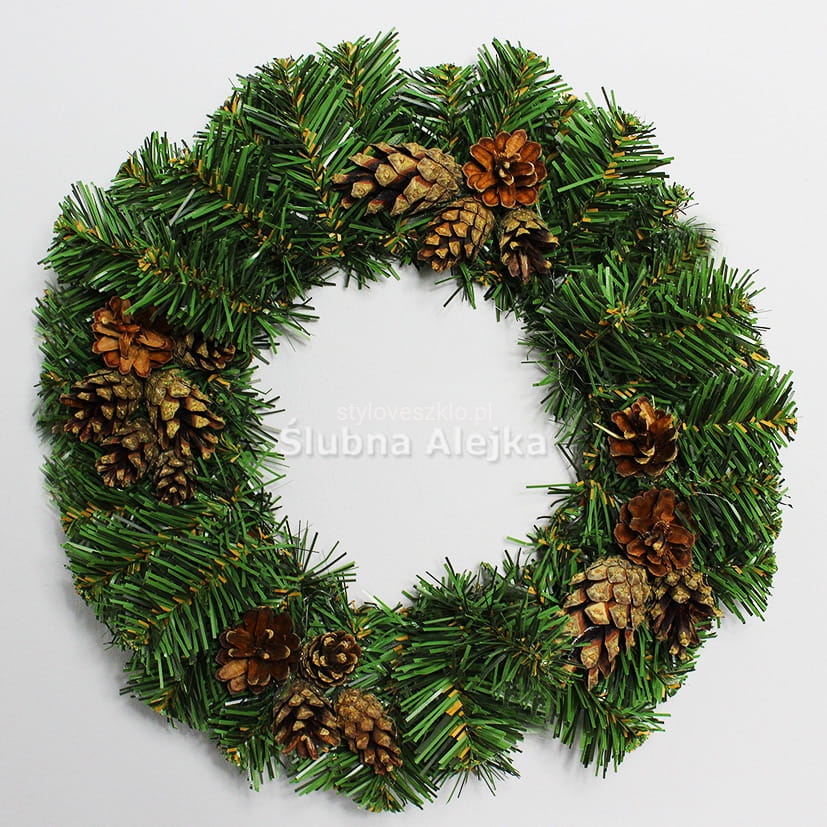 Piękny w swej prostocie wianek wykonany ze sztucznych gałązek zielonego świerku. Dodatkowo zdobiony szyszkami. Najczęściej stanowi bazę do wszelkich kompozycji florystycznych, ale może być także samodzielną ozdobą świąteczną. Do stosowania w domu, jak i na zewnątrz jako ozdoba tarasu, czy ogrodu. Łatwo przymocować do niego dodatkowe aplikacje. Udekorowany bombkami lub wstążkami znajduje swoje zastosowanie jako ozdoba świąteczna. Najpopularniejszym miejscem na powieszenie wianka są drzwi wejściowe restauracji lub domu, ale można go także umieścić na ścianie. Ten żywo zielony wianek stanowi idealną bazę do wykonania pięknej bożonarodzeniowej dekoracji w przystępnej cenie.