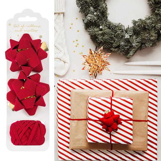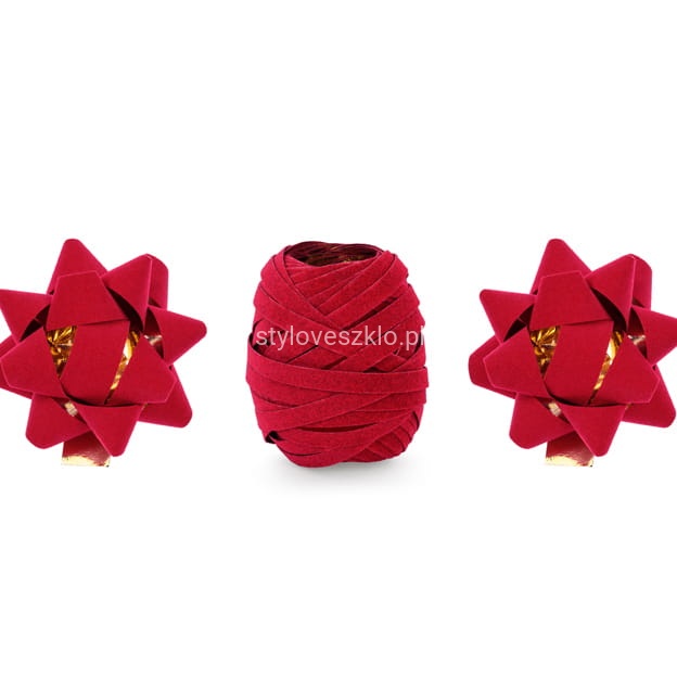 Wstążka i 2 rozety welurowe (czerwone na wierzchu i złote plastikowe w środku). Wymiary wstążki: szerokość ok. 5 mm, długość ok. 10 m, średnica rozety ok. 8 cm. Bardzo przydatne do dekoracji i pakowania prezentów, czy świątecznych ozdób. Bardzo dobrze komponuje się z dekoracjami świątecznymi w stylu kraft i merry christmas.