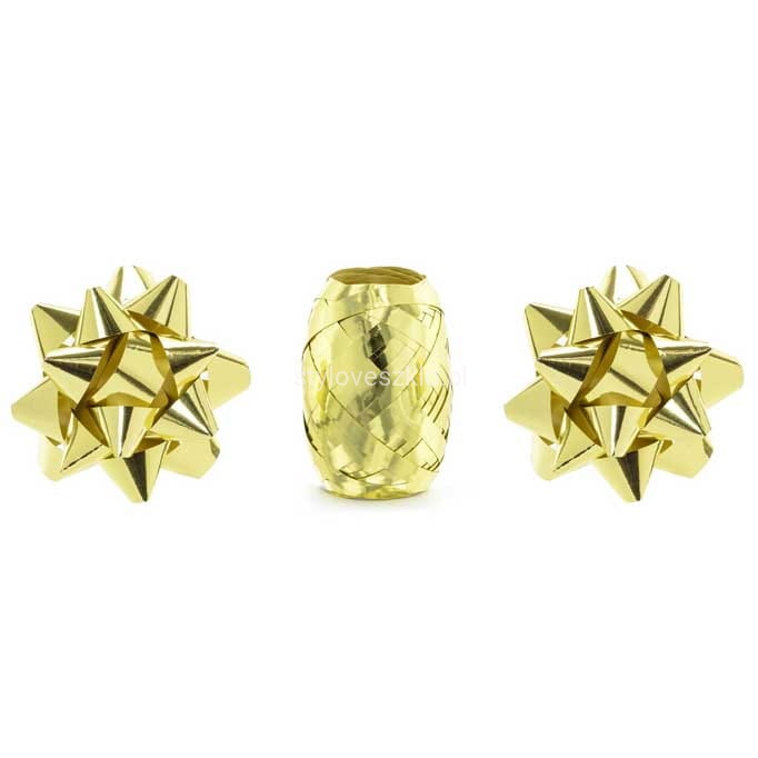 Wstążka i 2 rozety złote. Wymiary wstążki: szerokość ok. 5 mm, długość ok. 10 m, średnica rozety ok. 8 cm. Bardzo przydatne do dekoracji i pakowania prezentów, czy świątecznych ozdób. Bardzo dobrze komponuje się z dekoracjami świątecznymi w stylu kraft i merry christmas.