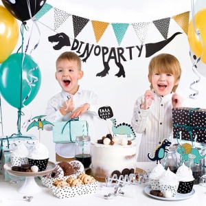 Zestaw dekoracji party - Dinozaury, zestaw zawiera: baner Dino Party (1 szt.), girlandę papierową (1 szt.), papilotki na muffinki (6 szt.), topper na tort (5 szt.), foremki na słodycze (2 szt.), słomki (10 szt.), srebrne gwizdki (6 szt.), balony (mix wzorów, 6 szt.), srebrne serpentyny (1 szt.) i tasiemkę satynową w kolorze butelkowej zieleni (szerokość 6 mm, 1 szt.)
